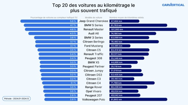Dans ce jeu de dupes, un modèle se distingue en 2024 : le Jeep Grand Cherokee. D’après les données de carVertical, 5 % des véhicules vérifiés de ce type en France présentaient un compteur trafiqué. Pourquoi lui ? Tout simplement parce qu’il est recherché. Un SUV apprécié sur le marché de l’occasion, avec un prix qui grimpe vite dès que l’on efface quelques dizaines de milliers de kilomètres. En moyenne, les Grand Cherokee « rajeunis » ont vu leur compteur réduit de 47 464 kilomètres.
